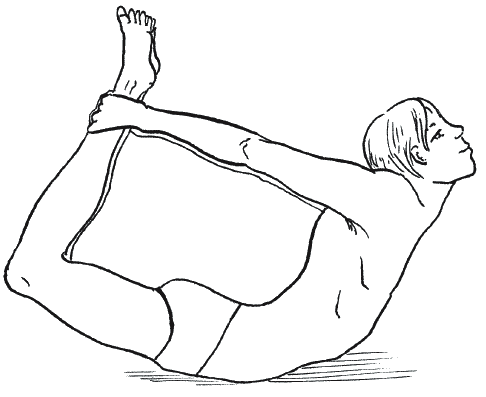 Принимают исходное положение лежа на животе, лицом вниз, ноги вместе, руки вытянуты вдоль туловища. На выдохе сгибают ноги в коленях и берутся руками за лодыжки. Затем, напрягая руки и пытаясь распрямить ноги, поднимают верхнюю часть туловища и бедра.