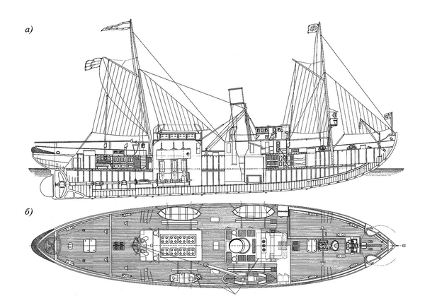 Рис. 044. «Гайдамак»: а) продольный разрез, б) верхняя палуба