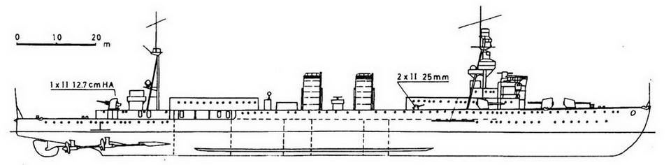 Броневая защита: палуба — 32 мм, главный броневой пояс — 64 мм, броневая рубка — 51 мм. Вооружение: 7 140 мм L50 (7 1 ств.), 2 80 мм (зен.) зен. L/40 (2 1 ств.), 2 13,2 мм зен. пулемета, ТА: 8 533 мм (4 2-х трубных), 80 мин, 1 самолет, 1 катапульта