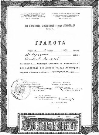 Грамота участника Олимпиады по математике В. Семенова. 1950 г.