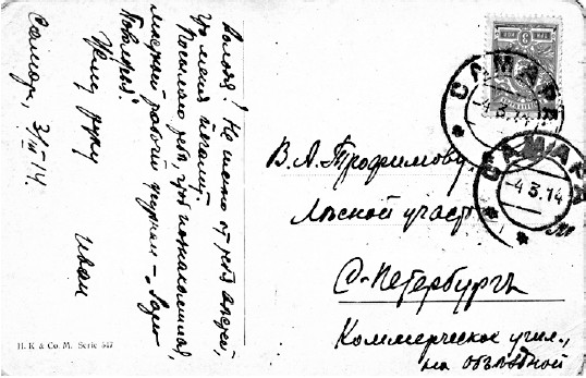 Открытка, присланная деду на адрес Коммерческого училища из Самары от И. Акулова, 1914 г. И. Акулов (1888–1937) – советский партийный государственный деятель. Активный участник большевистского подполья, с 1913 г. – член Исполнительной комиссии Петербургского комитета РСДРП. Репрессирован, реабилитирован посмертно