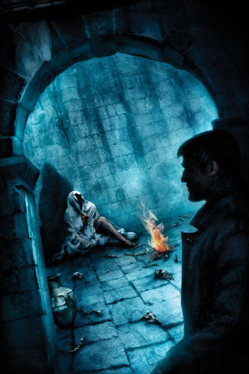 Костер был действительно совсем небольшим, сложенным из сломанных веток. Несколько кроличьих скелетов было разбросано вокруг. Наличествовал также кувшин… возможно, с водой. Молодой человек сидел в дальнем углу комнаты, но неприятный запах разносился от него по всему помещению. Свернувшись в темном углу так, чтобы сидеть поближе к огню, он кутался в грязные лохмотья.