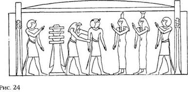 На некоторых рисунках фараону вручается «дед» – «вечность». Получив благословение Исиды и Нефтиды, он в сопровождении бога-сокола подходит к «дед», похожему на ракету со стабилизаторами (рис. 24).