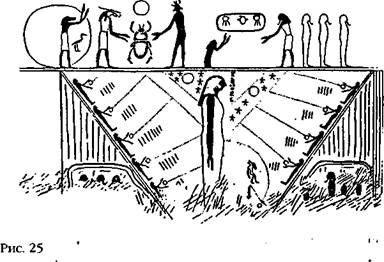 (Рисунок в гробнице Рамсеса IX дает основание предположить, что створки Двойных Дверей были наклонными; они открывались при помощи блоков и шкивов, которыми управляли по шесть богов у каждой створки. Затем через похожее на воронку отверстие вверх мог подняться гигантский человекоподобный сокол (рис. 25).