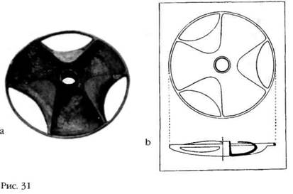 Технический чертеж уникального объекта (рис. 31b) не помогает пролить свет на его происхождение или назначение. Совершенно очевидно, что круглый предмет диаметром около двадцати четырех дюймов и максимальной толщиной менее четырех дюймов надевался на ось и должен был вращаться на ней. Три отверстия необычной формы могут свидетельствовать о том, что во время работы он вращался в какой-то жидкости.