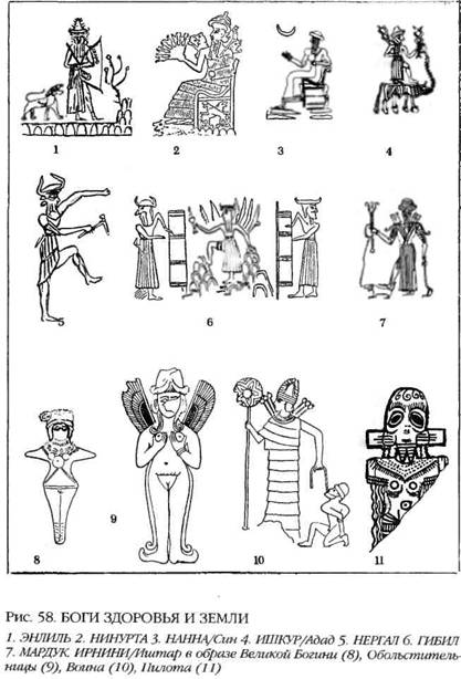 Когда слой грязи, покрывавший равнину между двух рек, высох и стало возможным заселение Шумера и земель на запад от него, вплоть до средиземноморского побережья, этот регион был отдан под начало сына Энлиля, которого звали НАН.НА (Син, по-аккадски). Это был великодушный бог, организовавший работы по возрождению Шумера, по восстановлению древних городов на прежних местах и строительству новых. Среди последних была его любимая столица Ур, родина библейского пророка Авраама. Рядом с его изображениями всегда помещали значок полумесяца, поскольку небесным аналогом Нанны считалась Луна (рис. 58). Младшему сыну Энлиля, которого звали ИШ.КУР (у аккадцев Адад) были отданы земли на северо-западе – Малая Азия и острова Средиземного моря – откуда цивилизация, или «царство», в конечном итоге распространилось на Грецию. Подобно древнегреческому Зевсу, Адад изображался верхом на быке и с разветвленной молнией в руке.