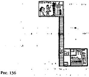 Многие выдающиеся египтологи теперь считают, что пирамида была лишь символическим местом захоронения Джосера и что в действительности фараон был погребен в богато украшенной «южной гробнице». Эту гробницу венчала большая прямоугольная надстройка со сводчатой комнатой, в которой располагалось обязательное святилище – как на некоторых египетских рисунках (рис. 136).