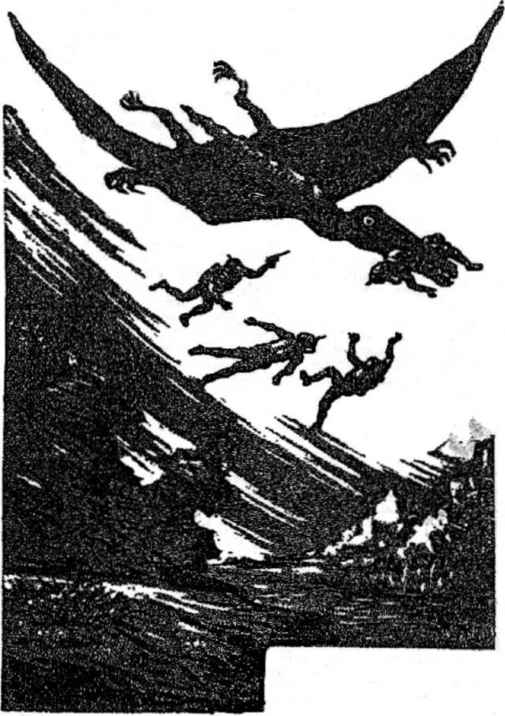 Широко раскинув могучие крылья, обтянутые черной блестящей кожей, он медленно набирал высоту. В длинной прямоугольной пасти, усеянной несколькими рядами огромных загибающихся зубов, ящер нес добычу. Она, видно, была тяжела для него, хищник медленно летел к горам.
