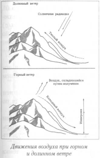 Ночью наблюдается обратная картина: воздух, прилегающий непосредственно к склону горы, охлаждается сильнее, чем воздух, находящийся на той же высоте, но удалённый от склона. Поэтому более холодный воздух опускается вдоль склона вниз и, кроме того, стекает от более высокой части долины к более низкой. Так возникает горный ветер. Горные ветры, устремляющиеся в долины, могут усиливаться до 20 м/с.