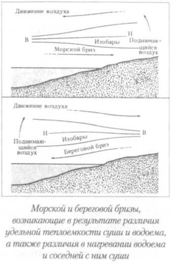 Такую же природу образования восходящих и нисходящих потоков воздуха имеют местные ветры – бризы, дующие днём с водной поверхности (морей, озёр, рек) на сушу (морской бриз), ночью с суши на водную поверхность (береговой бриз). При этом днём над сушей изобары поднимаются, над водной поверхностью опускаются. Наоборот ночью над сушей опускаются, над водной поверхностью подымаются.