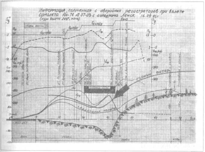Но после 46 секунды, по записи магнитофона, слышен посторонний шум, неустойчиво работает радиовысотомер с падением показаний до 0° из-за касаний верхушек деревьев…