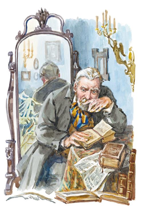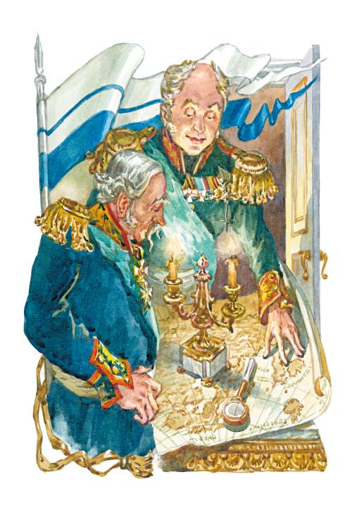 Государь оглядывается на Платова: очень ли он удивлён и на что смотрит; а тот идёт глаза опустивши, как будто ничего не видит, – только из усов кольца вьёт.