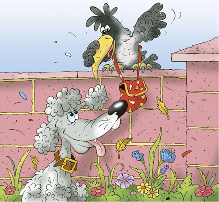 – Кра-ха-ха! Ты наверно решил, что вороны плохо видят и плохо соображают!? Так вот, уважаемая собака! Мы очень даже хорошо видим, а соображаем ещё лучше! – Тут она соскочила с ветки на крышу, оттуда перелетела на забор поближе к пуделю и почему-то шёпотом произнесла: