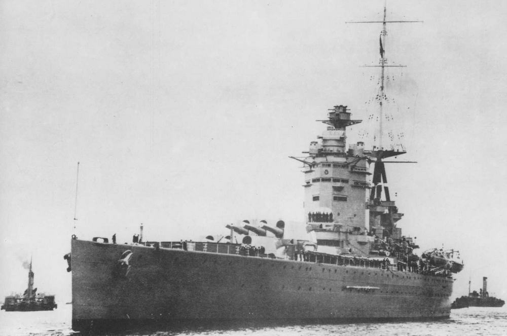 “Нельсон” на буксире ведут к выходу из базы (в центре).