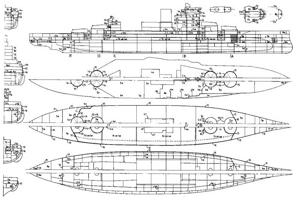 (Продольный разрез, планы палуб и сечения с указанием толщин обшивки и брони).