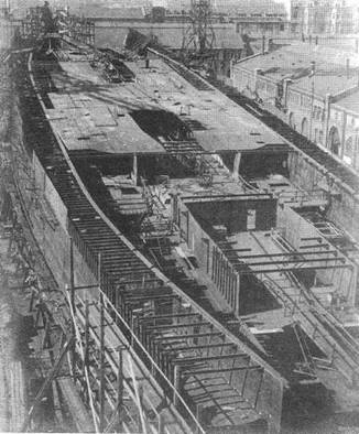 Водоизмещение крейсера составляло: нормальное 26 600 т, полное 31 200 т; Conway [6] приводит соответственно 26 180 т и 30 700 т. Длина корабля: полная 210,4 , между перпендикулярами 210 м (на 10 м длиннее, чем у “Зейдлица”), ширина 29 м (на 0,5 м шире, чем у “Зейдлица”), осадка носом 9, 2 м, кормой 9,56 м; высота борта в середине корпуса 14,75 м., (на 0,87 м больше, чем у “Зейдлица”). Увеличение осадки на 1 см соответствовало увеличению нагрузки на 40,1 т. Корпус корабля разделили водонепроницаемыми переборками на XVI основных отсеков. Двойное дно было установлено на 65% длины корабля. Способ связей конструкции корпуса – сборка по продольному набору стрингеров.