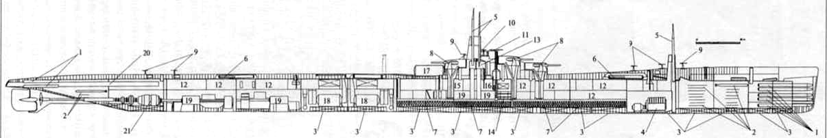 1. 533 мм ТА 2. запасные торпеды 3. ЦГБ 4. ДГ 5. перископ 6. палубные 533 мм ТА 7. АБ 8. 2-х орудийная башня 9. 45-мм зенитное орудие 10. дальномер зенитных орудий 11. артиллерийский дальномер 12. кубрики личного состава 13. боевая рубка 14. погреба БЗ 15. радиорубка 16. ЦП 17. ангар ГСМ 18. паровые котлы 19. офицерские каюты 20. ПТА 21. минная труба 22. ГЭД