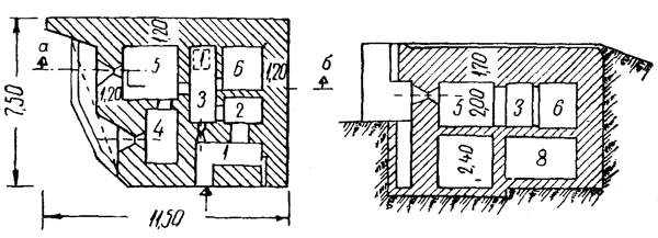 Орудийно-пулеметный полукапонир: 1 – сквозник; 2, 3 – тамбуры; 4 – пулеметный каземат; 5 – орудийный каземат; 6 – снарядная; 7 – лаз в нижний жилой каземат; 8 – жилой каземат