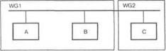 Для примера допустим, что в вашей одноранговой сети три компьютера А, В, С. Первые два входят в рабочую группу WG1, а компьютер С — в рабочую группу WG2 (см. рис. 1.5).