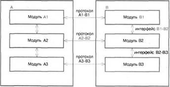 Из рис. 1.6 видно, что средства, которые обеспечивают взаимодействие модулей разных уровней в рамках одной системы (например, В1 и В2), называются интерфейсом, а средства, обеспечивающие взаимодействие компонент одного уровня разных систем (например, А1 и В1), называются протоколом. Протокол и интерфейс можно сравнить еще и так: разговор двух директоров разных предприятий можно назвать протоколом, а разговор директора и подчиненного одного предприятия можно считать интерфейсом. Как вы уже догадались, разговор сотрудников разных предприятий будет протоколом.