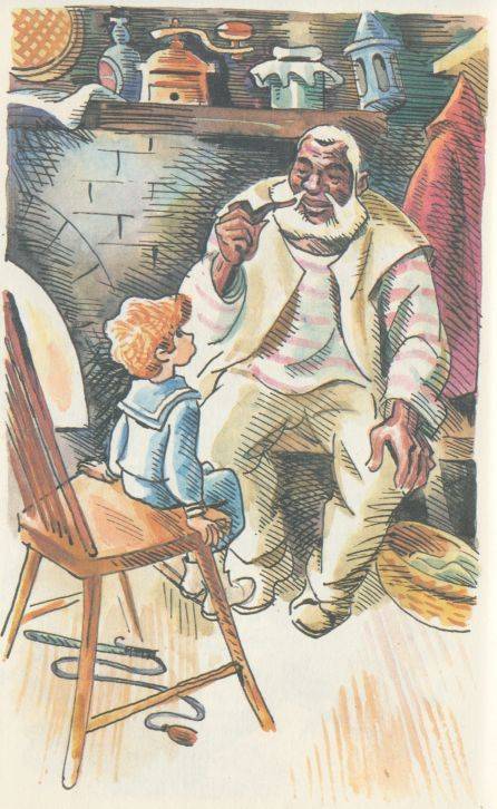 Как-то вечером мама долго искала своего сынишку. Джоэля не было ни в доме, ни во дворе. Она услышала голоса в старой хижине дядюшки Римуса, заглянула в окно и увидела, что мальчик сидит рядом со стариком.