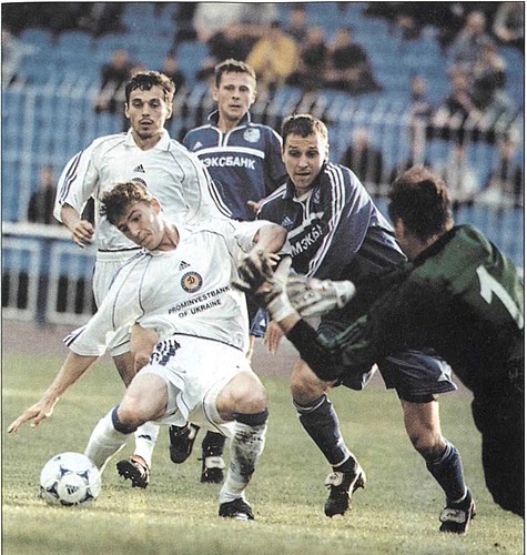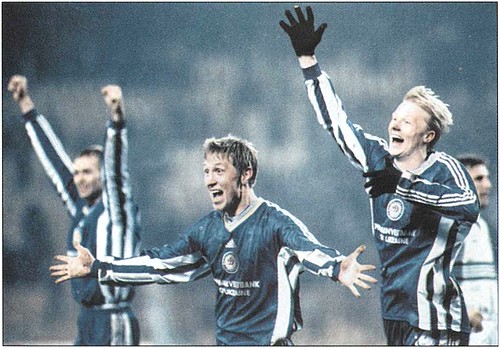 и один из авторов книги А. Франков на стадионе «БайАрена» в Леверкузене за день до матча группового турнира Лиги чемпионов с местным «Байером». 1999 год