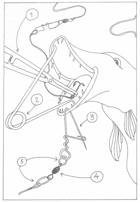 1 — зажим хирургический; 2 — зевник; 3 — булавка кукана; 4 — карабин; 5 — заводное кольцо