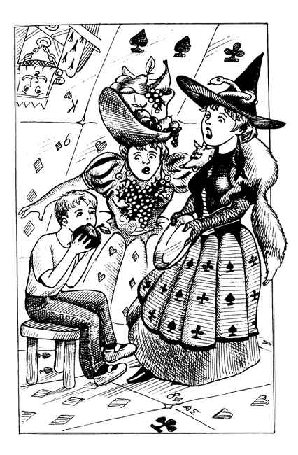 Фруктовая дама знаком пригласила его присесть. Митя не без опаски опустился на карточный табурет, но тот оказался, на удивление, прочным. Радушная хозяйка поставила перед Митей блюдце с голубой каёмочкой и, сорвав со шляпы большое спелое яблоко с красным бочком, положила его на блюдце.