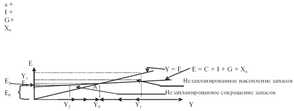 Таким образом, отрезок Y2 – Y0 показывает, что те расходы, которые субъекты экономики планируют осуществить, значительно превышают тот объем выпуска, который был реально произведен. Спрос превышает предложение, и фирмы вынуждены для удовлетворения потребностей покупателей поставлять на рынок некогда созданные запасы. Так достигается равновесное значение уровня выпуска и потребления.