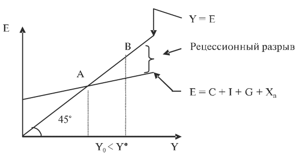 Рецессионный разрыв – это потенциальная величина совокупных расходов, которая необходима для того, чтобы фактический равновесный объем выпуска достиг своей потенциальной величины в условиях полной занятости всех ресурсов (рис. 2).