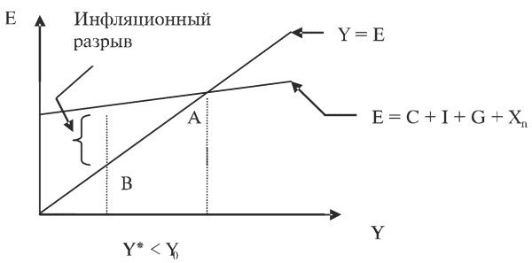 Инфляционный разрыв характеризуется величиной, на которую должны уменьшиться планируемые расходы для обеспечения соответствующего снижения фактического ВВП и равновесия до уровня потенциального. На рисунке 3 показан инфляционный разрыв. В данном случае совокупный спрос чрезмерен, вызывает кризис недопроизводства. В условиях дефицита товаров растут цены, и начинает раскручиваться инфляционная спираль. Поэтому крайне важной является мера по сдерживанию совокупных расходов. Когда экономика преодолевает инфляционный разрыв, равновесие перемещается из точки А в точку В, спрос снижается, и ситуация стабилизируется.