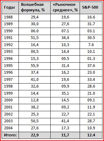 Однако давайте посмотрим, что произойдет, если мы слегка поднимем планку. Хорошо бы эта формула работала, для любых компаний, независимо от того, большие они или маленькие. Тогда мы прониклись бы уверенностью в том, что основной принцип — покупать собственность хороших компаний по выгодным ценам — срабатывает независимо от размеров компании. Ладно, давайте вместо того, чтобы возиться с 3500 компаниями, ограничимся 2500 самых больших из этого числа. Самые мелкие из них обладают рыночной ценностью никак не меньшей 200 миллионов долларов. За последние 17 лет (завершившихся в декабре 2004 года) волшебная формула отлично работала и для этой группы самых крупных компаний. Обладание портфелем ценных бумаг из 30 наборов акций, отобранных с помощью волшебной формулы, давало ежегодную прибыль в 23,7 процента. Причем за то же самое время рыночное среднее этой группы составляло 12,4 процента годовых. Иначе говоря, среднюю годовую прибыль волшебная формула почти удваивала.