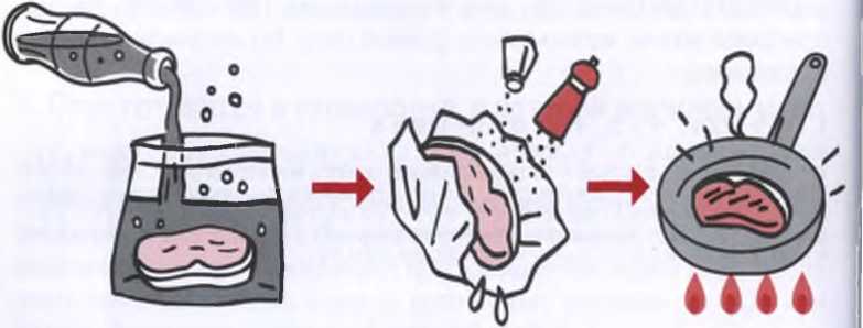 Положить мясо для стейка в герметичную посуду и полностью залить его колой. Продержав 10 минут, мясо вынимают и, слегка обтерев бумажной салфеткой, посыпают солью и черным перцем. После этого мясо жарят, и оно остается мягким и сочным даже после полного прожаривания.