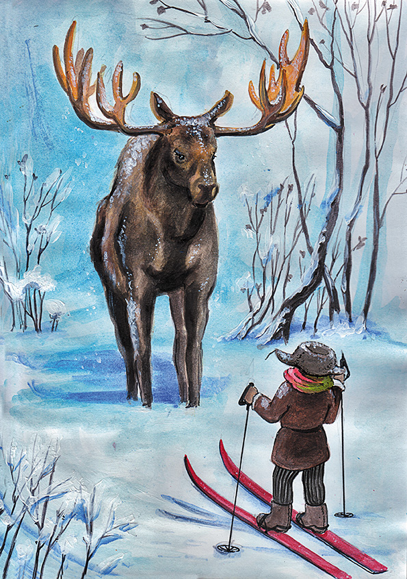 Мальчик не сразу его заметил. Видимо, лось уже давно лежал, ему там было уютно и безопасно, его даже припорошило снегом. Он был защищён со спины обрывом, а впереди был хороший обзор. Врасплох его хищник застать не мог. Когда сохатый убедился, что его заметили, он встал на ноги и внимательно посмотрел на мальчика. Животное было огромное, с большими ветвистыми рогами, из ноздрей при дыхании шёл пар.