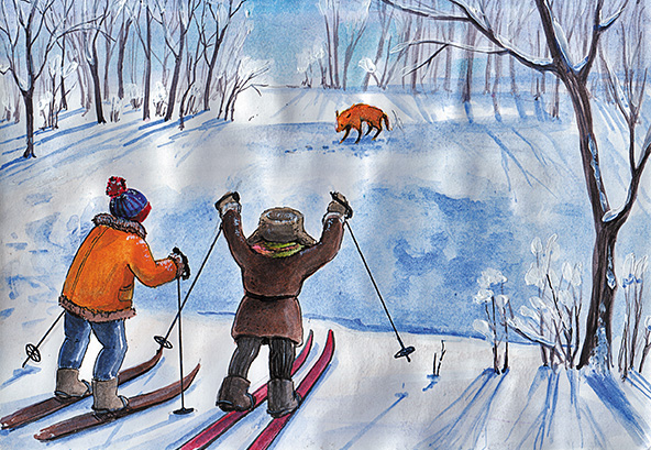 Когда мальчик выбрался из оврага, лиса ещё «мышковала», и он оказался у неё за спиной. Она временами тявкала в ответ дразнившему её Алексею и металась из стороны в сторону, не замечая ничего вокруг. Геннадий тем временем приблизился к лисичке на близкое расстояние и сначала резко зарычал, а затем громко гавкнул и застучал лыжами по снегу. От неожиданности рыжая плутовка высоко подпрыгнула и, увидев рядом человека, быстро побежала, но, поскользнувшись, уткнулась мордочкой в снег. Затем, отбежав на безопасное расстояние в поле, остановилась, внимательно посмотрела назад, пару раз тявкнула и стремительно убежала, нервно дёргая пушистым рыжим хвостом.