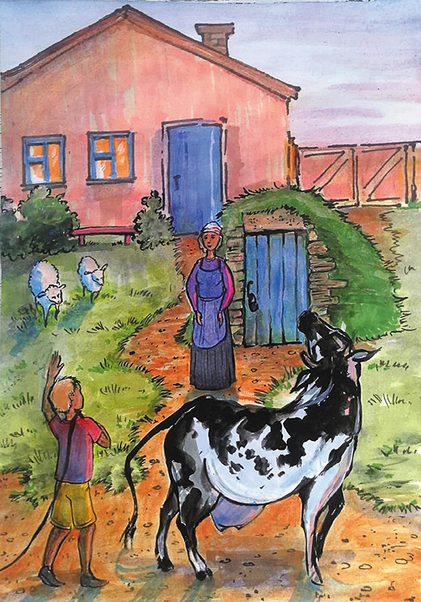 – Ты уж присмотри за моей рябой коровой, чтобы раньше времени не убежала домой из стада. Ты ведь уже знаешь, привычка у неё непутёвая такая!