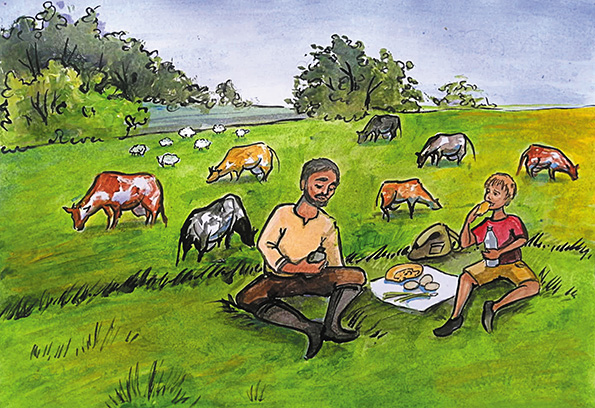 Ранний подъём и дальняя прогулка по свежему воздуху пробудили чувство голода. Михаил расположился на небольшой возвышенности, откуда было хорошо видно всё стадо, достал из походной сумки припасы, приготовленные мамой, и разложил на белоснежном с вышивкой рушнике. Вскоре подошёл папа, оглядел округу и шутливо, но с одобрением произнёс: