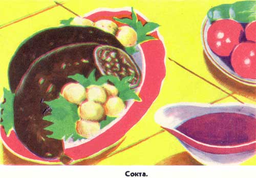 В обработанные кишки закладывают подготовленный фарш, наполняя не очень туго, и завязывают нитками. После этого сокту отваривают и доводят до готовности так же, как и сокту с крупой.