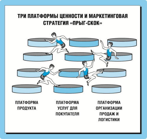 При этом та платформа, продвижение по которой компания предпочтет сегодня, определяется ее текущей конкурентной ситуацией и тем, за счет чего ей сейчас легче всего будет обыграть соперничающие фирмы. В такой модели стратегия развития товарного предложения фирмы перестает быть линейной, а становится скорее скачкообразной: то компания «вспрыгивает»