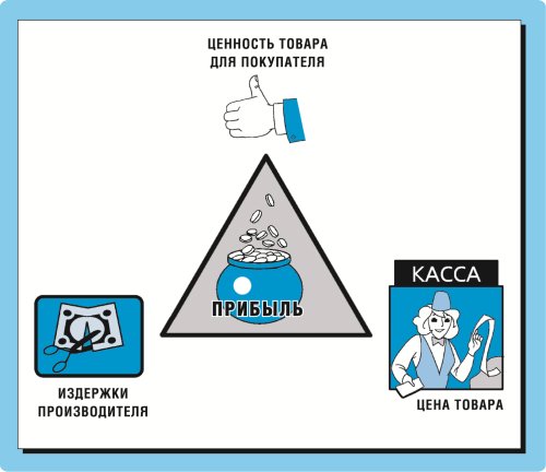Смысл этого рисунка в том, что для увеличения прибыли менеджер должен выбирать какой-либо из способов «изменения формы и площади треугольника прибыли», корректируя либо издержки, либо цену, или, наконец, ценность товаров для покупателей.
