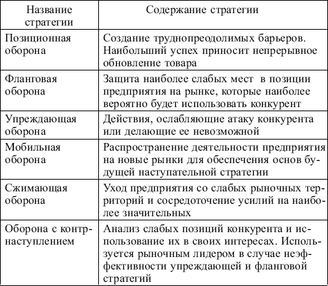 • рыночный лидер – предприятие с наибольшей рыночной долей в отрасли (в области цен, разработки товаров рыночной новизны, минимизации затрат на маркетинг). Для того чтобы остаться лидером, предприятие старается расширить рынок путем привлечения новых покупателей, освоения новых сегментов, увеличения частоты применения выпускаемого товара. Рыночный лидер часто использует оборонительные стратегии (табл. 3.5);