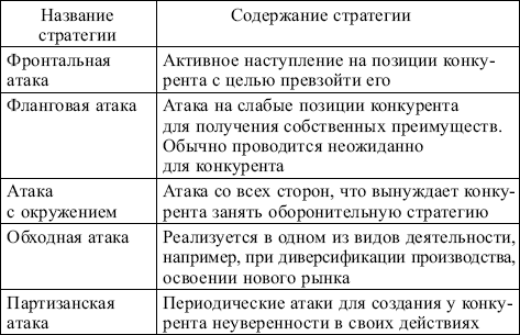 • рыночный претендент – предприятие, которое борется за увеличение своей рыночной доли и вхождение в число лидеров. Рыночный претендент часто использует атаковые стратегии (табл. 3.6);