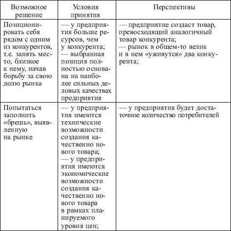 Возможные решения предприятия о собственном позиционировании (при условии знания позиций конкурентов) представлены в табл. 3.14.