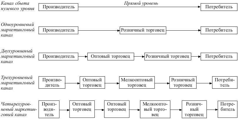 Каналы сбыта с разным числом уровней представлены на рис. 6.2. Характеристика каналов сбыта приведена в табл. 6.3.
