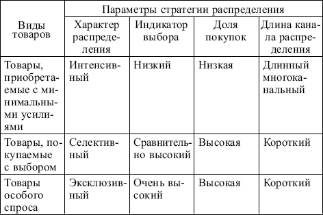 При выборе стратегии распределения необходимо учитывать вид товара (табл. 6.10).