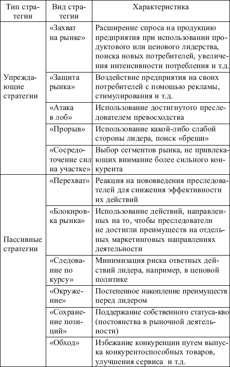 Предприятия, занимая определенное положение на рынке, могут выбрать упреждающую или пассивную стратегию для обеспечения своих конкурентных преимуществ (табл. 7.12).