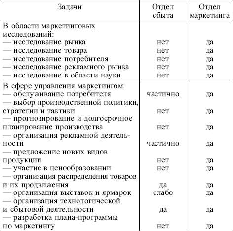Цель отдела сбыта заключается в организации управления процессом реализации. Отдел маркетинга имеет своей целью организацию управления динамикой взаимодействия производителей и потребителей. Принципиальное различие задач этих отделов представлено в табл. 1.7.