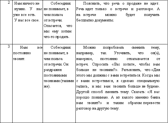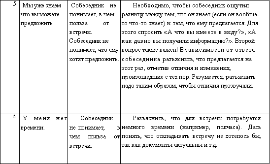 При отказе от встречи важно установить истинную причину этого отказа (она может и не соответствовать той отговорке, которую пользователь произносит). Как правило, она заключается в непонимании пользователем цели встречи. Конкретно, он не понимает, какую пользу эта встреча может ему принести. И вторая, менее распространенная причина, заключается в том, что наш собеседник в организации не принимает решения о таких встречах (либо он не является заинтересованным в услуге лицом, либо он не вправе принимать эти решения). Приведем основные отговорки потенциальных клиентов и соответствующие им контраргументы, которые следует употребить, в таблице