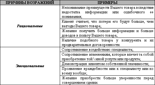 В соответствии с этим, все причины возражений могут быть отнесены к двум классам: рациональные и эмоциональные.