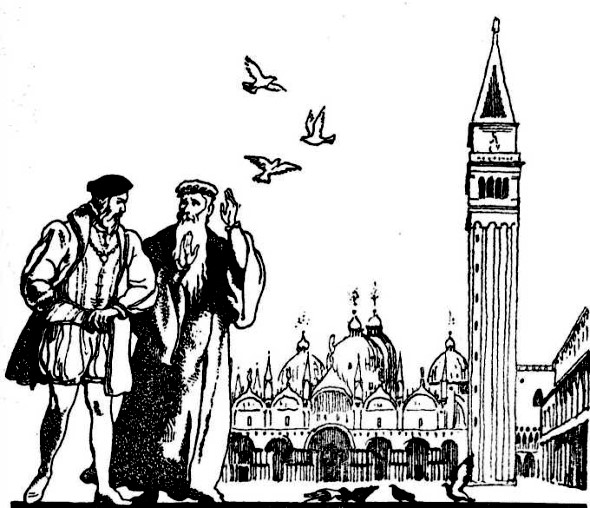 — Эге, любезный маэстро, — воскликнул старик, слегка обидевшись, — уж не называете ли вы заурядным художником представителя корпорации живописцев, учителя стольких мастеров, прославивших Венецию? Они — ее блистательнейшее созвездие. Вы сияете в нем как самая большая звезда, но мой ученик Тициан Вечеллио блистает не менее ярко.